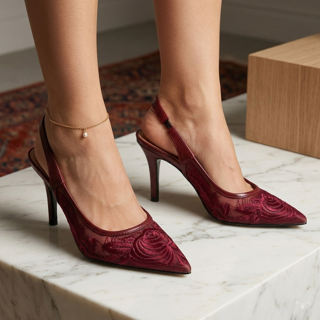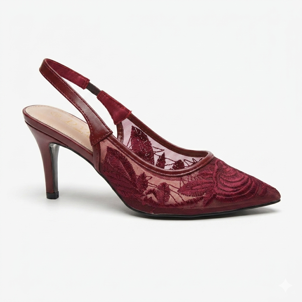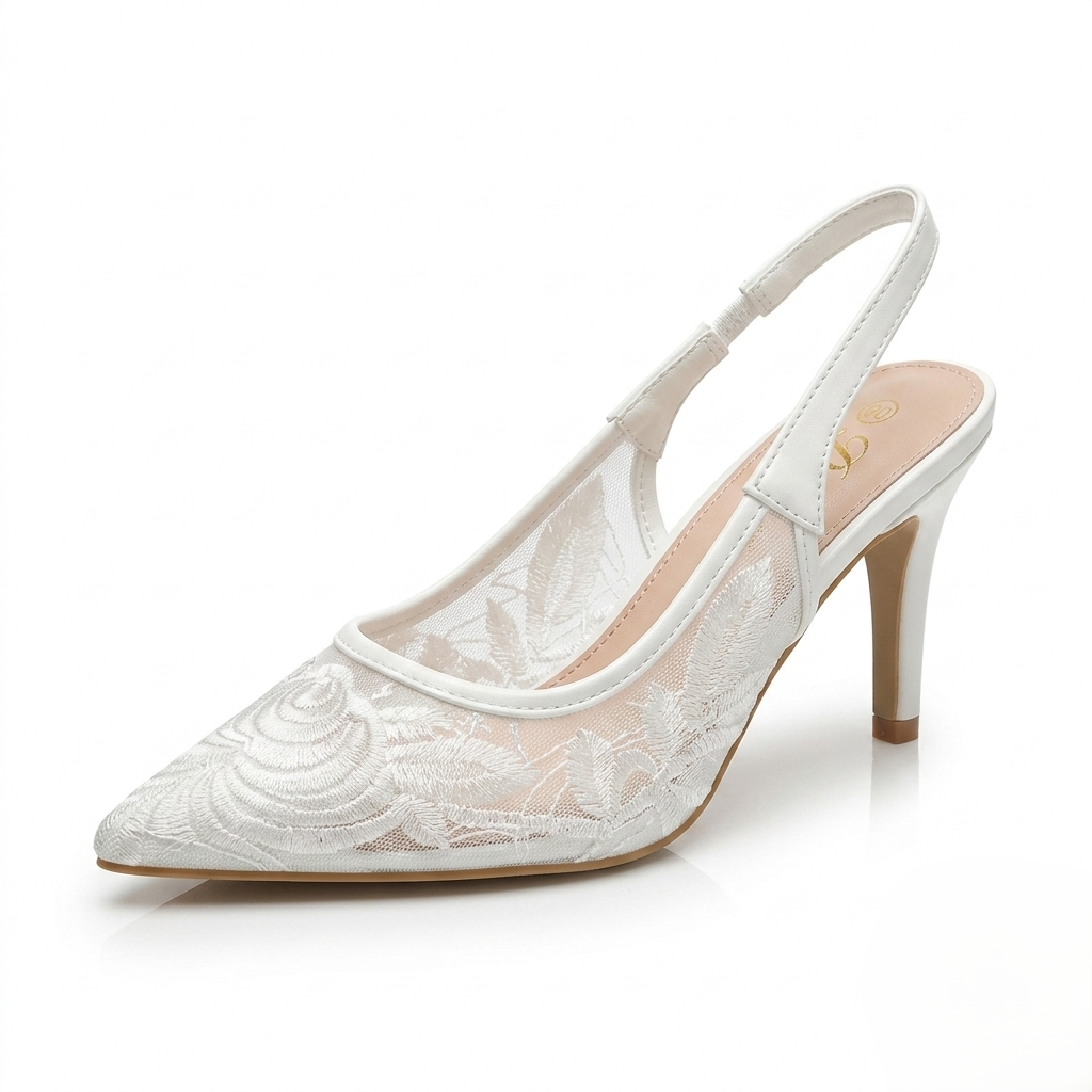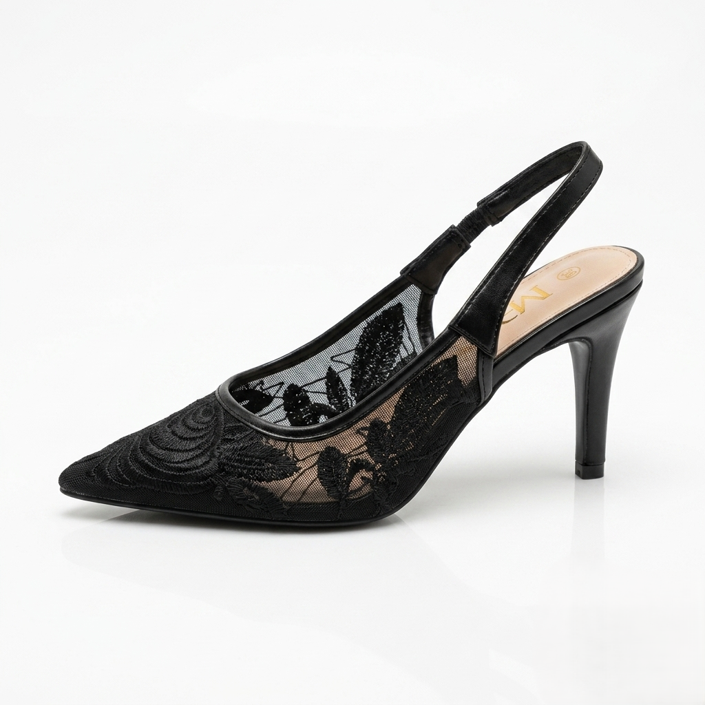Apportez une touche de raffinement à votre garde-robe avec cet escarpin au design délicat. Confectionné en maille transparente ornée de motifs floraux, il sublime le pied avec légèreté et féminité. Son bout pointu allonge la silhouette, tandis que la bride arrière assure un maintien confortable tout au long de la journée ou de la soirée.