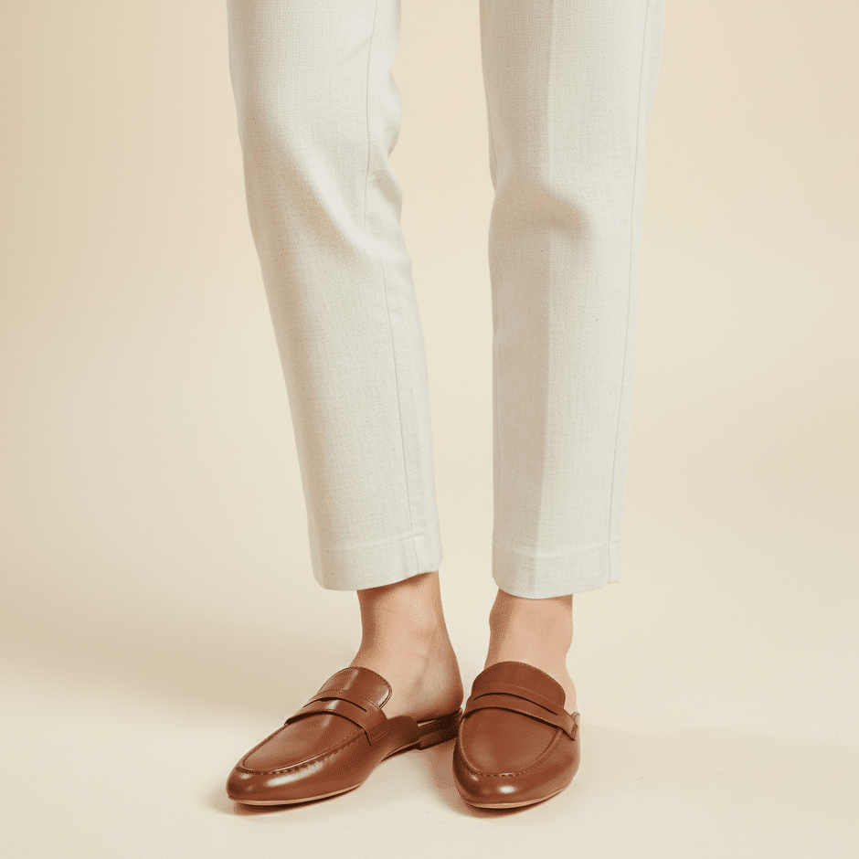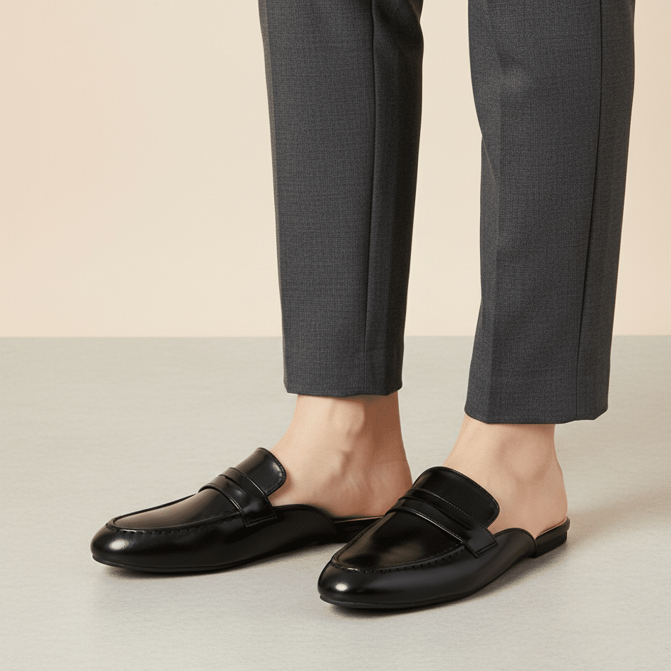 La bande large sur le dessus assure un bon maintien du pied tout en apportant une touche moderne et structurée. La semelle plate légère garantit un confort optimal pour une utilisation prolongée, que ce soit au bureau, en sortie ou lors d’occasions décontractées élégantes.
